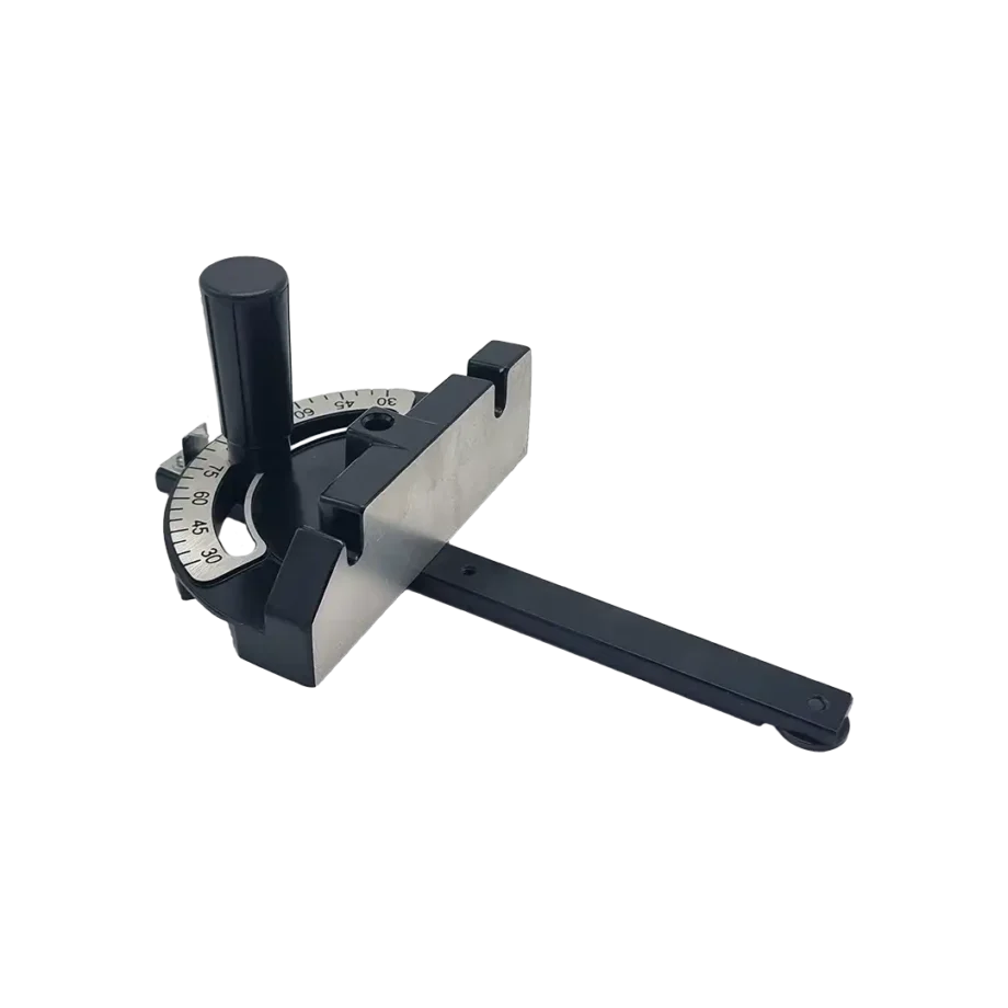 Sturdy and high quality all-steel angle guide for woodworking machines. The guide has mounting slots for which you can make an extension, for example in wood or metal, if you wish. The guide pivots in both directions to angles of 90-30°.
