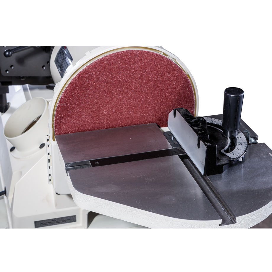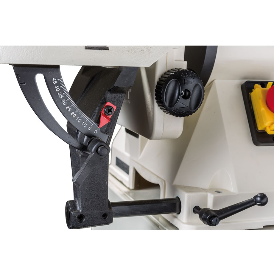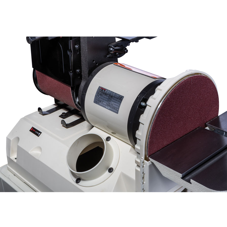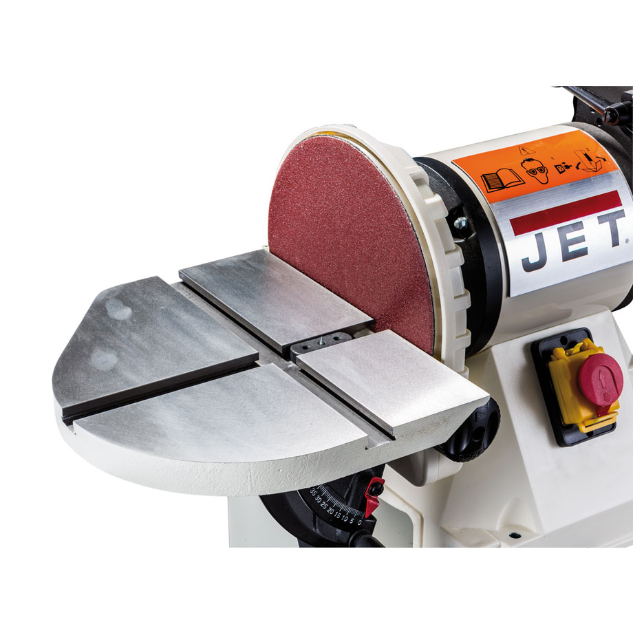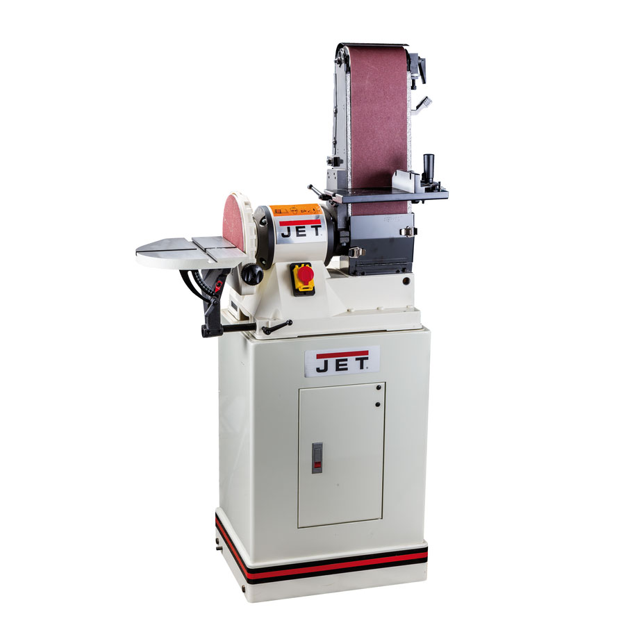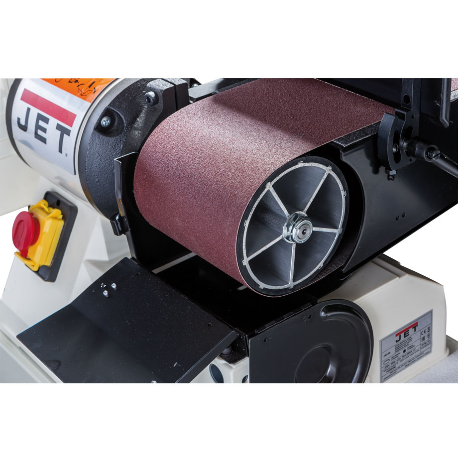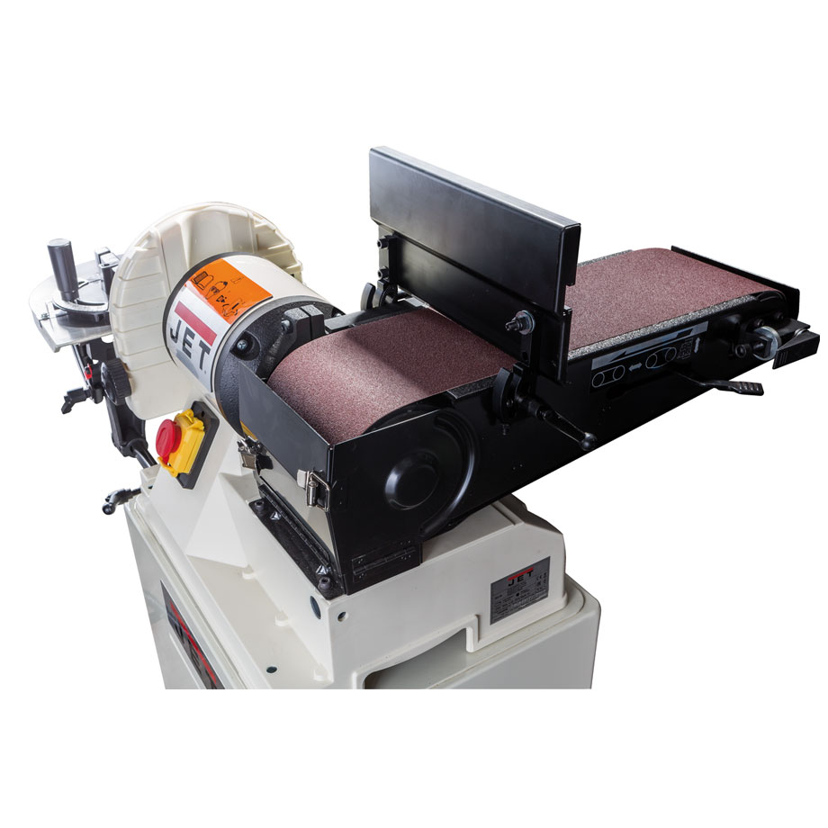 Der Jet JSG-96 ist ein leistungsstarker und robuster Band und Tellerschleifmaschine mit einem 150 x 1220 mm großen Schleifband, einer 230 mm großen Klett-Schleifscheibe und um 0-45° neigbaren Tischen. Das Schleifband lässt sich durch Lösen einer Schraube in Sekundenschnelle in die vertikale oder horizontale Position neigen. Die gerade Schleiffläche des Bandes beträgt 370 x 150 mm, was für die meisten Anwender mehr als ausreichend ist.