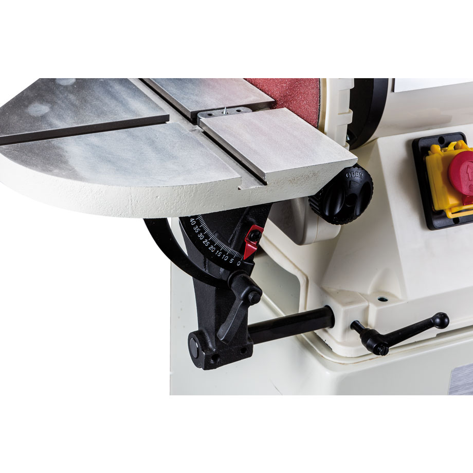Beide Schleifeinheiten verfügen über Absperrklappen, mit denen Sie die gesamte Saugleistung des Staubabsaugers entweder auf die Scheibe oder auf das Band lenken können, um eine maximale Staubabsaugleistung zu erzielen. Im Lieferumfang enthalten sind ein G60-Schleifband, eine G60-Klettscheibe, eine Klettscheibenbasis, eine Winkelführung und eine tischmontierte Vorrichtung zum Schleifen von abgerundeten Werkstücken.