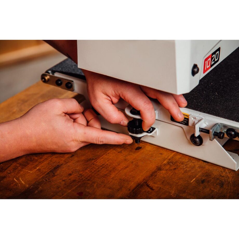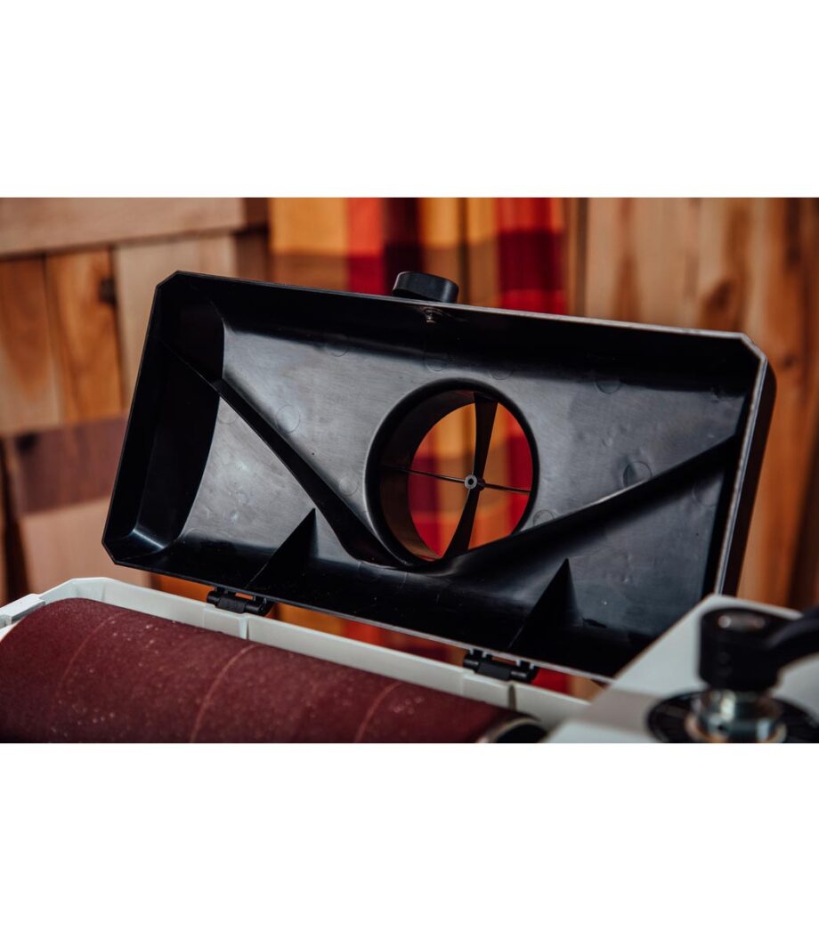 - Das Förderband lässt sich ohne Werkzeug einfach durch Drehen eines Knopfes parallel zur Schleifwalze einstellen