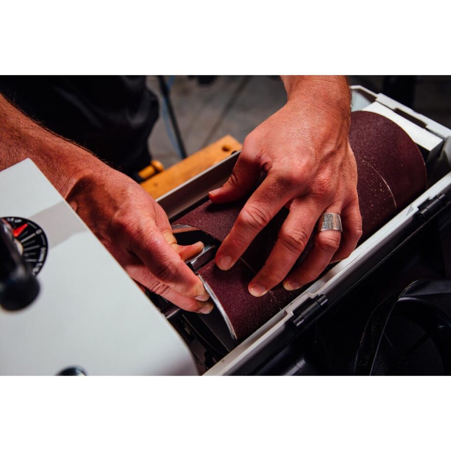 Das Schleifband ist benutzerfreundlich gestaltet und lässt sich schnell und einfach in weniger als 2 Minuten ohne Werkzeug austauschen. Mit der Maschine können Sie vorgeschnittene Schleifbänder oder Sie können ganz einfach Streifen in der richtigen Größe aus einem Schleifpapierrolle.