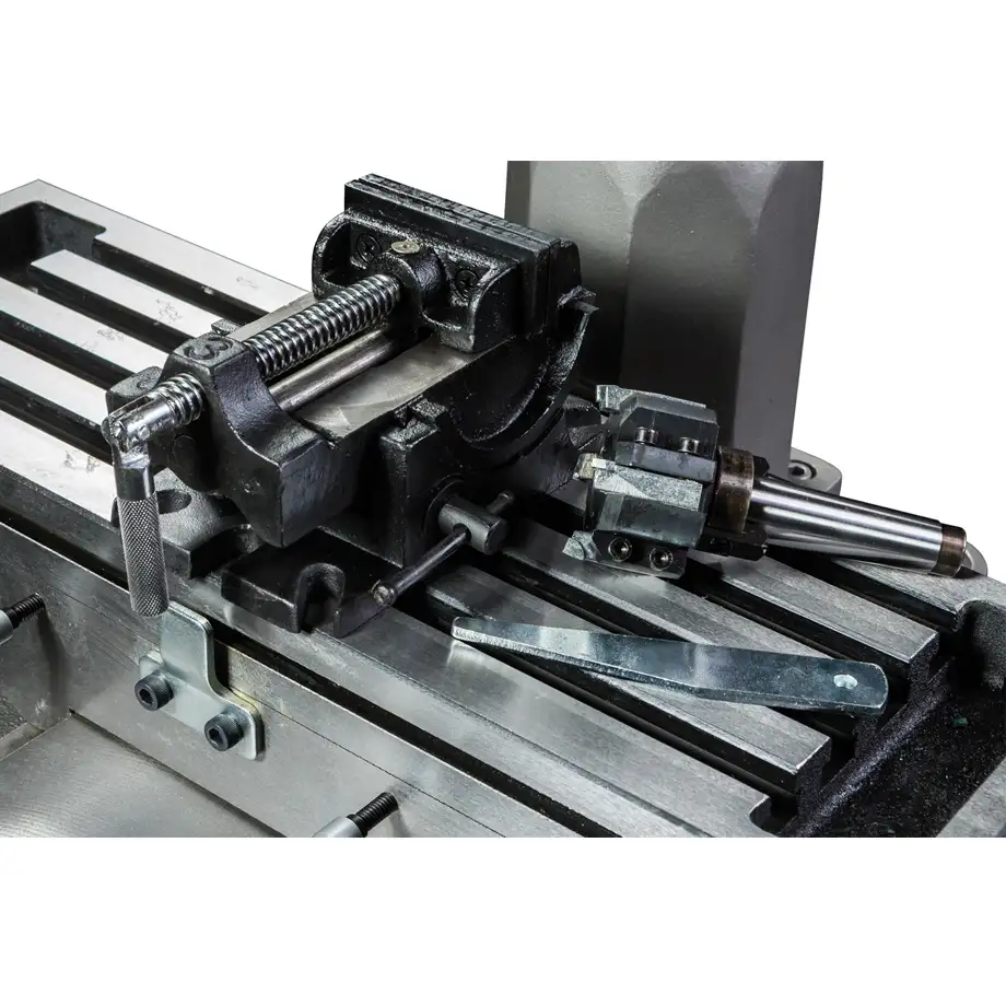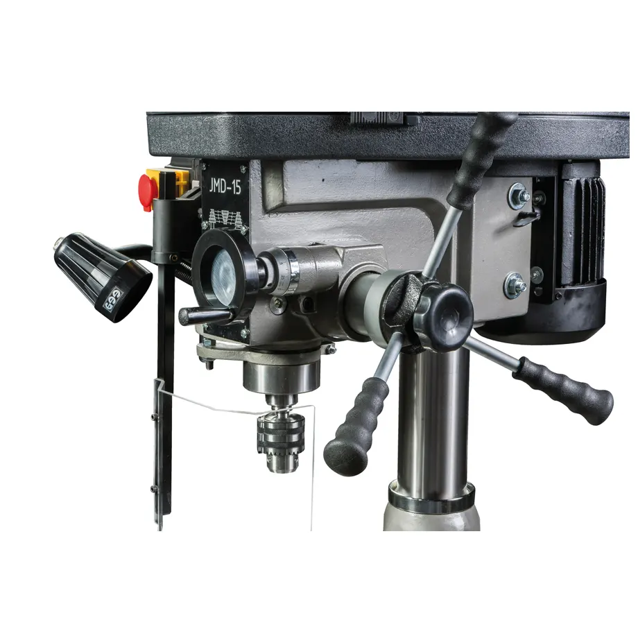 Model JMD-15 dostarczany jest bogato wyposażony: imadło kątowe 0–90°, uchwyt wiertarski, trzpień uchwytu, ściągacz, lampa LED oraz frezo-czoło z węglika 63 mm.