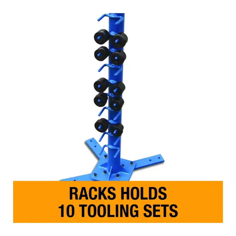 - Heavy-duty steel stand includes an integrated roll rack capable of storing up to 10 tooling sets when not in use.