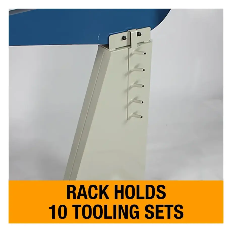 - Heavy-duty steel floor stand features a built-in die rack for storing up to 10 roll sets