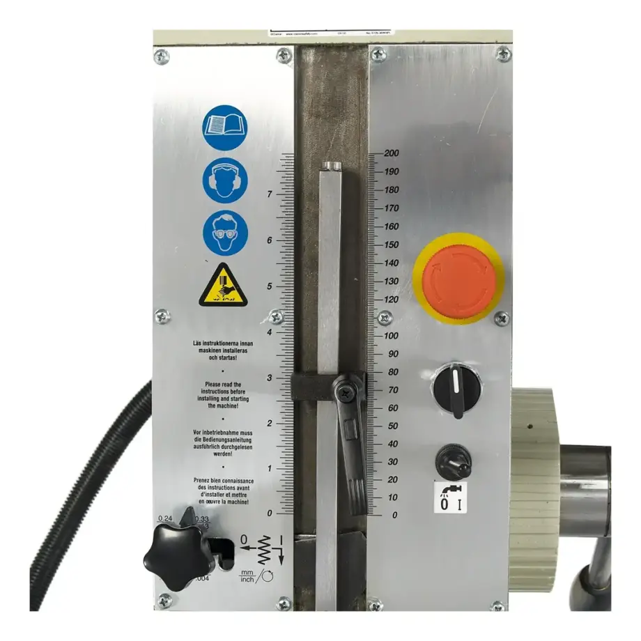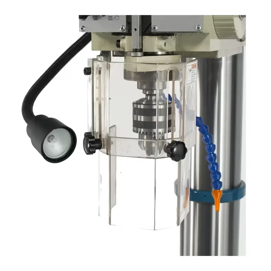 - Protective shield surrounding the drill head enhances operator and shop safety