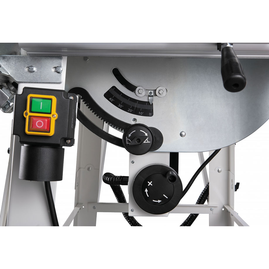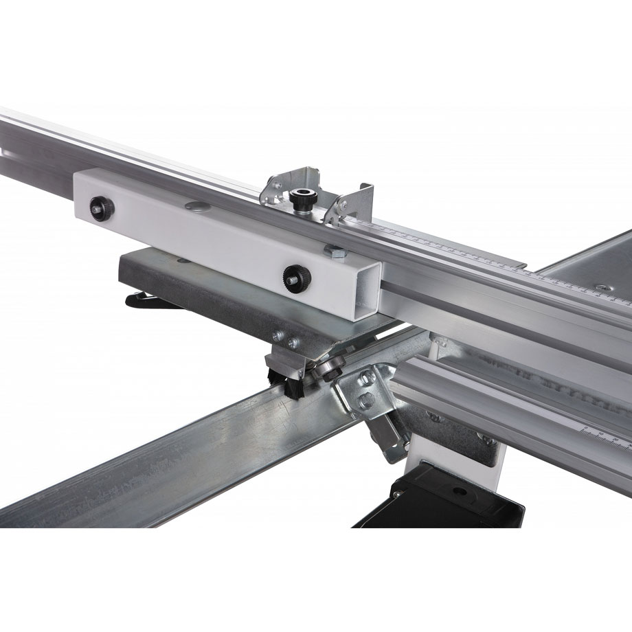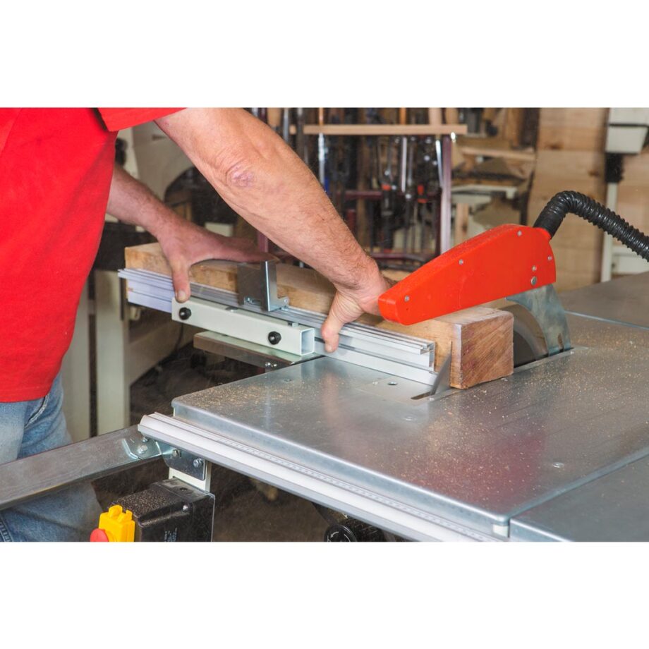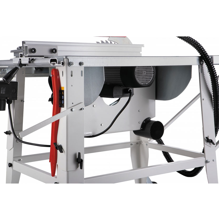 The eccentric clamping rip fence locks securely and aligns quickly, maintaining parallelism with the blade for consistent rip accuracy. A rear extension table is supplied as standard, significantly improving material support when cutting longer workpieces, while an optional right-hand extension table further increases cutting width for large-format materials.