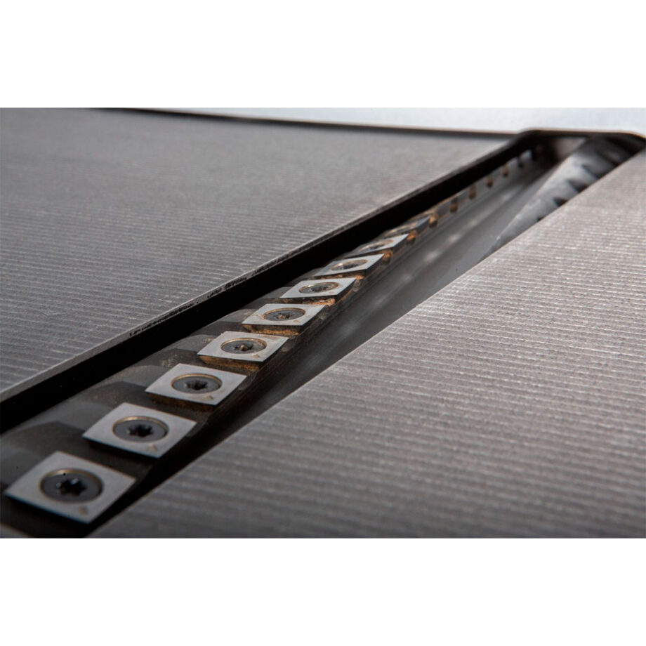 Hårdmetallskären är testade att hålla upp till 4000 % längre än traditionella HSS-knivar, vilket innebär att du inte behöver bekymra dig om knivbyten på många år. Om ett skär skulle skadas kan du enkelt vrida det med den medföljande Torx-nyckeln och fortsätta arbeta på några sekunder – helt utan tidskrävande justeringar.